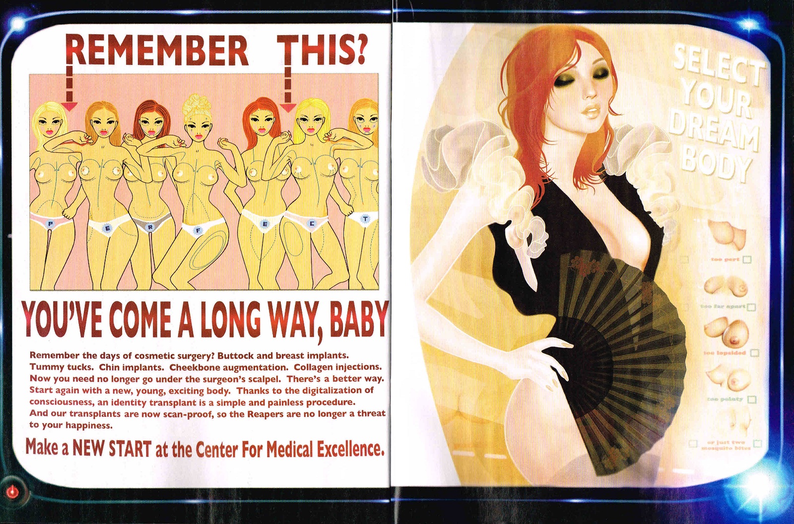 We learn a new body snatchers' name, Salvatore Bobone (name of the stolen identity).This strip is followed by a two page advert from the illegal Center For Medical Excellence. Back cover of the magazine displays a leaflet issued by the Bureau For The Prevention of Identity Theft.